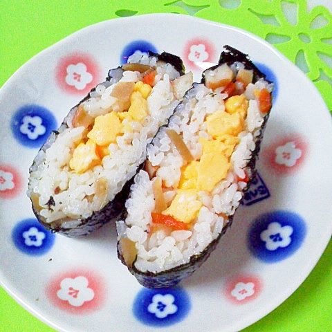 海苔は半分 混ぜ込みきんぴら 炒り卵のおにぎらず レシピ 作り方 By Mama Papa 楽天レシピ