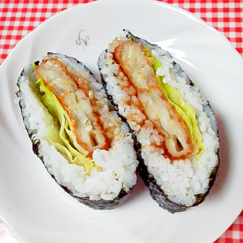 海苔は半分 おにぎらず お魚コロッケ レタス レシピ 作り方 By Mama Papa 楽天レシピ